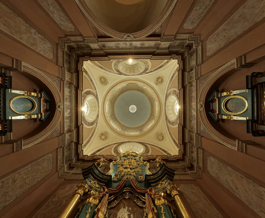 Wewnętrzne obramowania okien są marmurowe, zaś w białym piaskowcu wyrzeźbiono herby Leszczyńskich i Tęczyńskich. Wnętrze kaplicy ozdobione jest pilastrami arkadowymi, trójdzielnymi, a całość kopuły bogato rzeźbiona.
